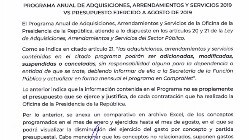 Para saber la postura de la Presidencia de la República respecto de los gastos arriba enlistados se contactó al personal de comunicación social de la vocería, pero no proporcionaron datos del documento al respecto.