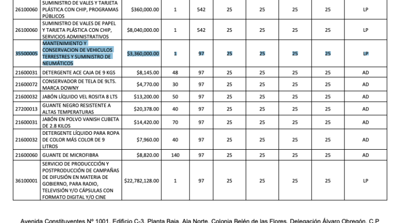 Otro rubro que pone en tela de juicio los dichos del presidente es el concerniente al mantenimiento de autos, en el listado aparece un apartado para “Mantenimiento y conservación de vehículos terrestres y suministro de neumáticos” por 3,360,000 pesos.