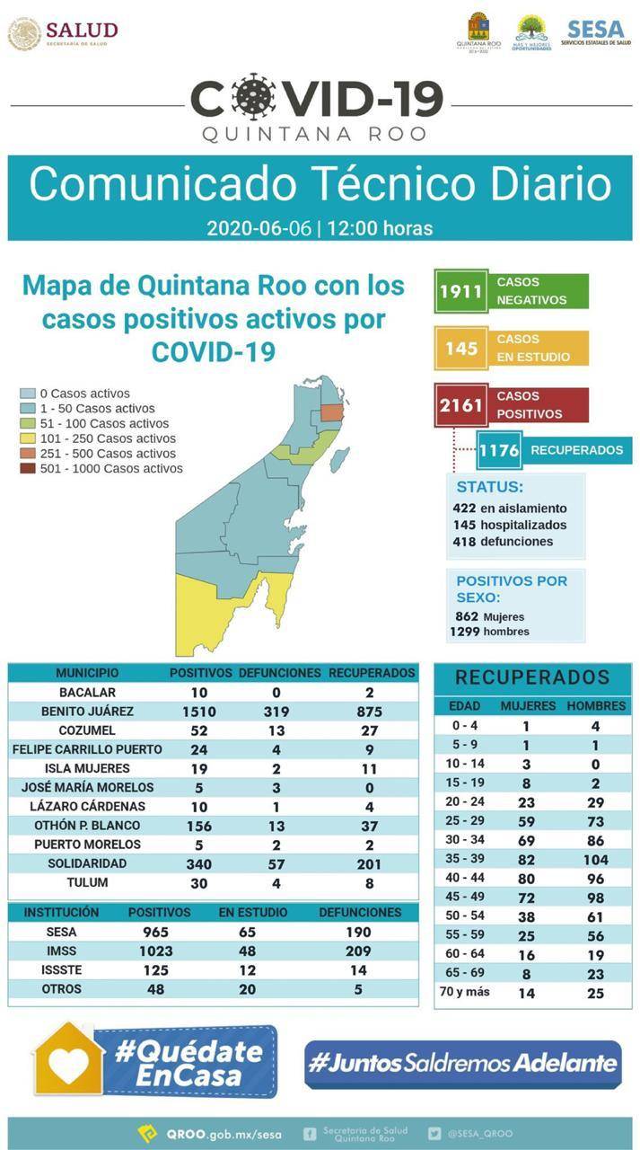 Hasta las 12 horas del 06 de junio, se han notificado 1911 casos negativos, 145 en estudio, 2161 positivos, 418 defunciones y 1176 personas recuperadas a COVID-19.